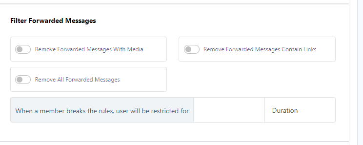 The `Filter Forwarded Messages` feature offers you the capability to control and manage forwarded messages within your group. This feature provides the following options: