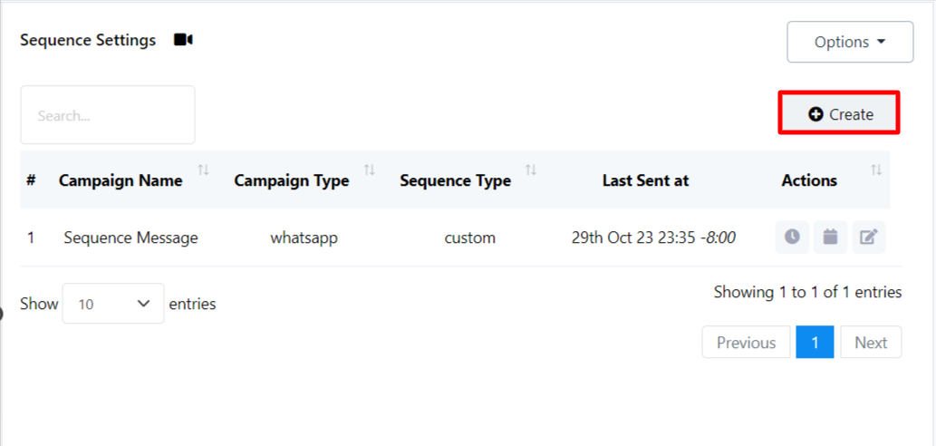 Create a New Sequence Message Campaign: Also, there is an option to create new sequence from here. To create a new sequence just click on the `Create` button.